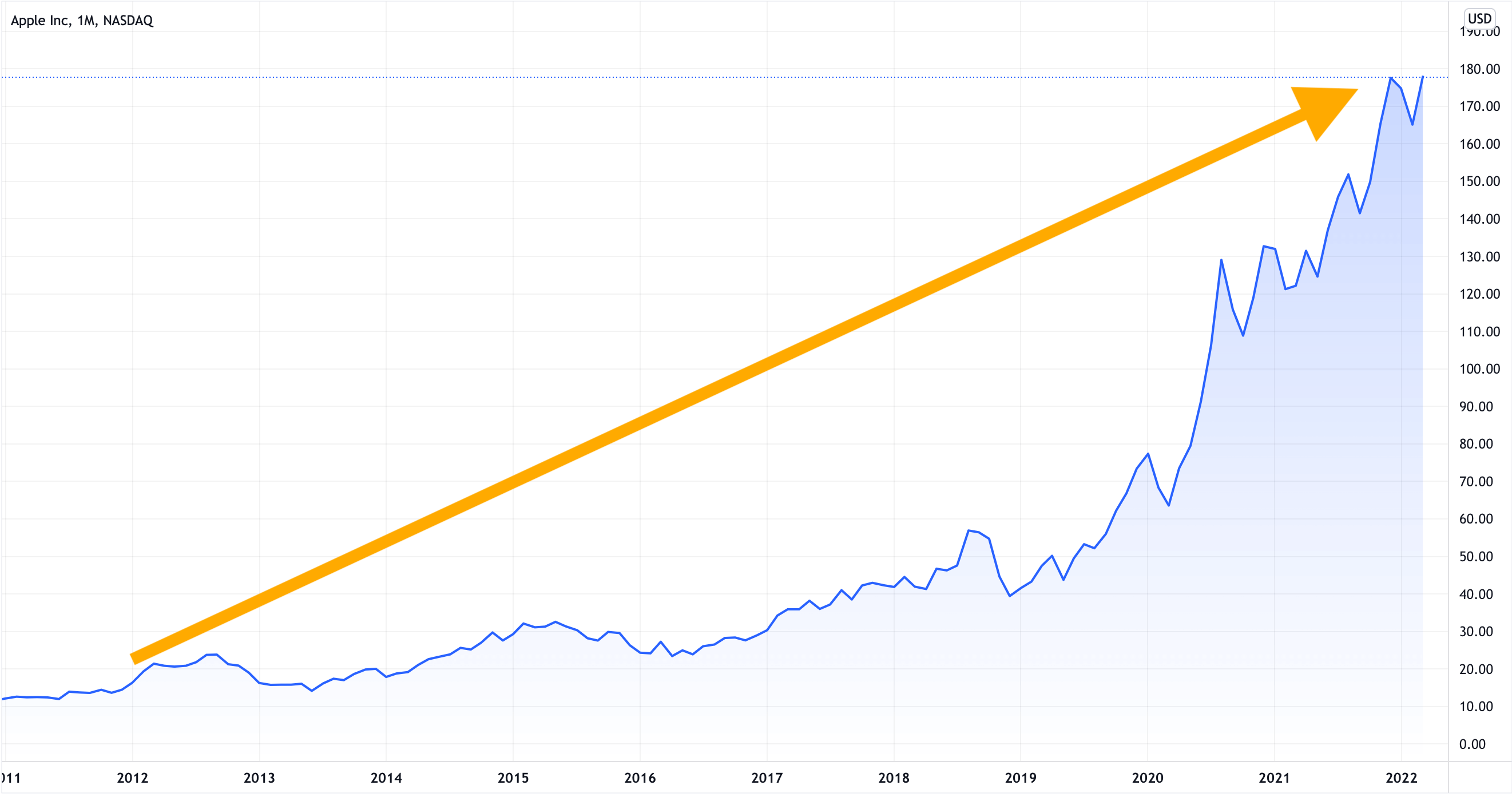 Представим, что вы купили акции компании Apple Inc. в марте 2012 года по цене $20 за штуку. Тогда к началу 2022 года — когда стоимость акций выросла до $178 (с учетом сплита), — каждая акция бы выросла в стоимости на 790%.