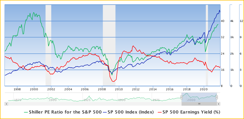 Динамика (1) коэффициента Шиллера P/E (зеленая линия; левая ось), (2) котировок фондового индекса S&P 500 (синяя линия; средняя ось) и (3) доходность S&P500 (красная линия; правая ось) за период с 1997–2021 гг. Дата обращения: 3 декабря 2021 г. Источник: GuruFocus.