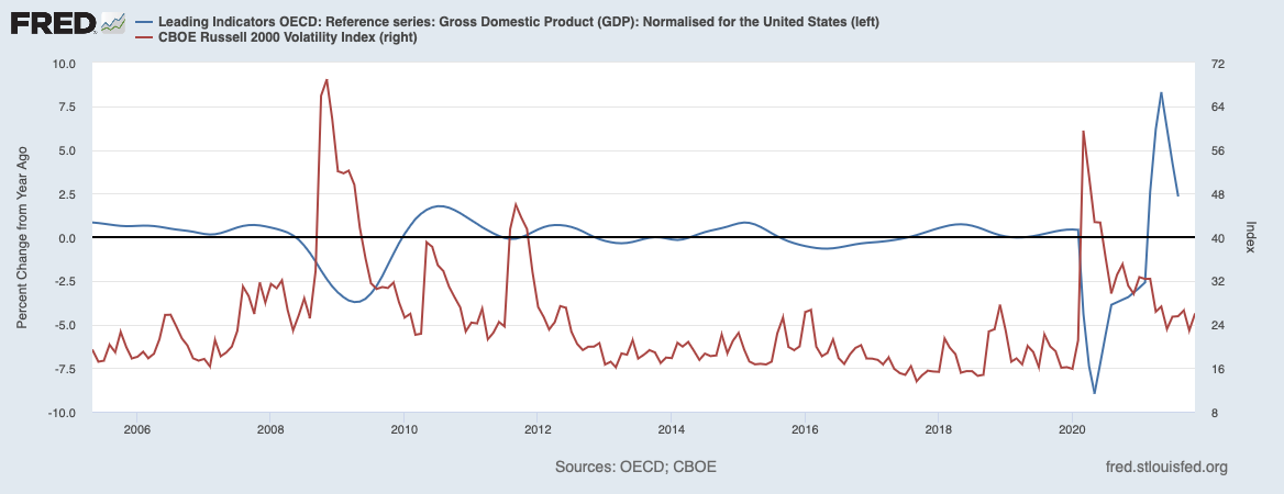 Динамика опережающего индикатора ВВП (процентное изменение год к году; синяя линия; левая ось) и индекса волатильности Russell 2000 (красная линия; правая ось) за период с 2006–2021 гг. Дата обращения: 3 декабря 2021 г. Источник: fred.stlouisfed.org.
