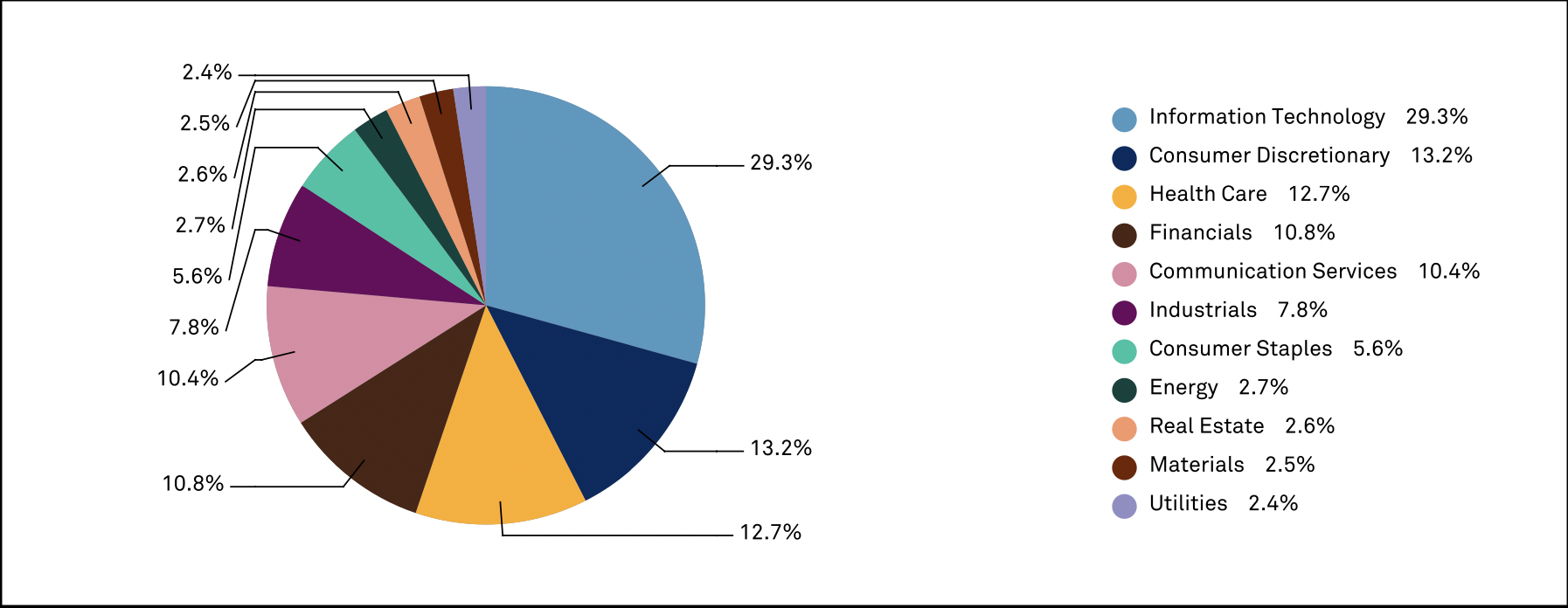 Более 50% индекса приходится на три сектора: информационные технологии, потребительские товары выборочного спроса и здравоохранение. При этом почти треть индекса занимает сектор информационных технологий.