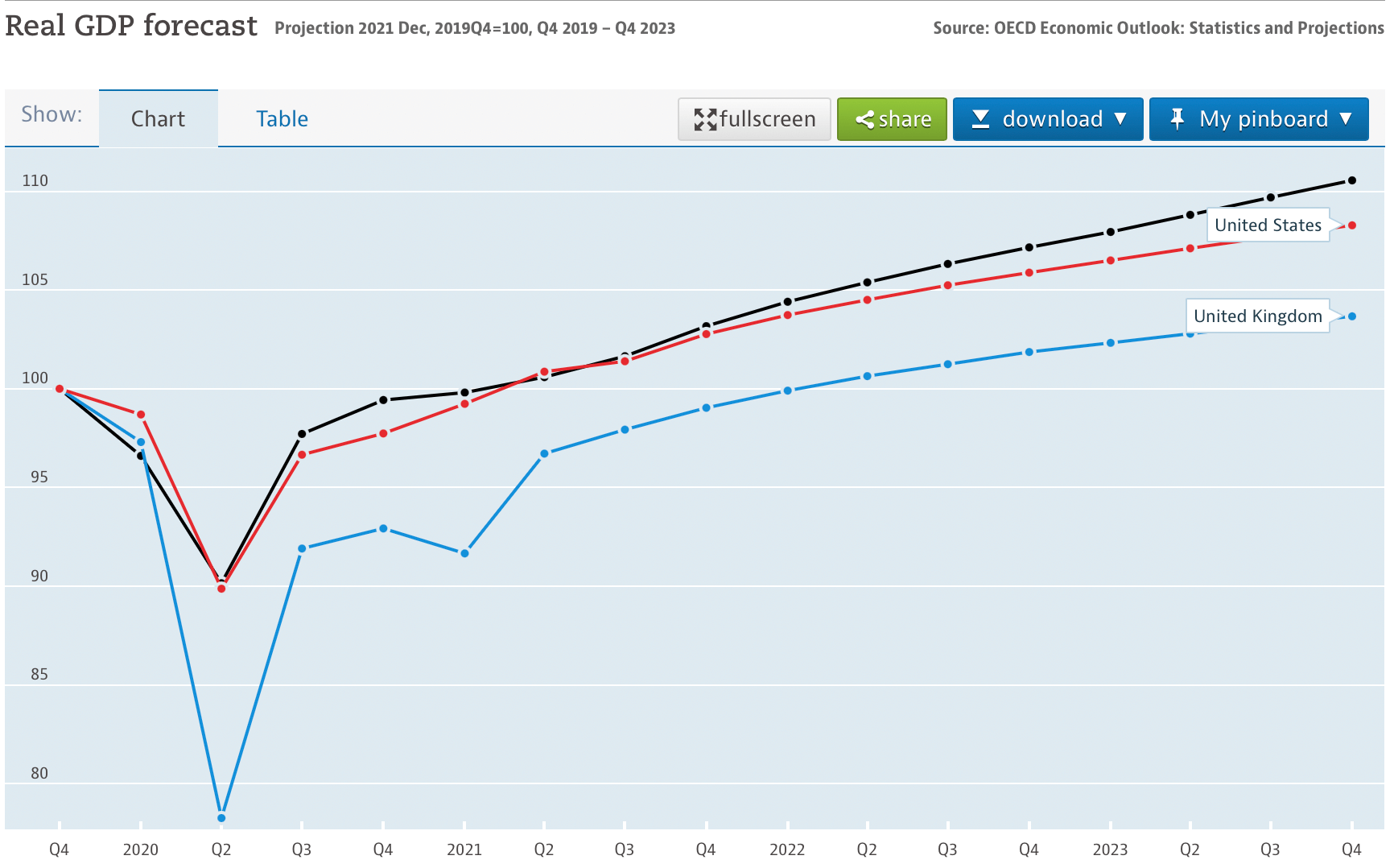 Прогноз динамики реального ВВП США (красная линия) и Великобритании (синяя линия) до конца 2023 г. Значение ВВП в 4 квартале 2019 г. принято за 100 единиц. Дата обращения: 06.01.2022. Источник: OECD Economic Outlook:Statistics and Projections.