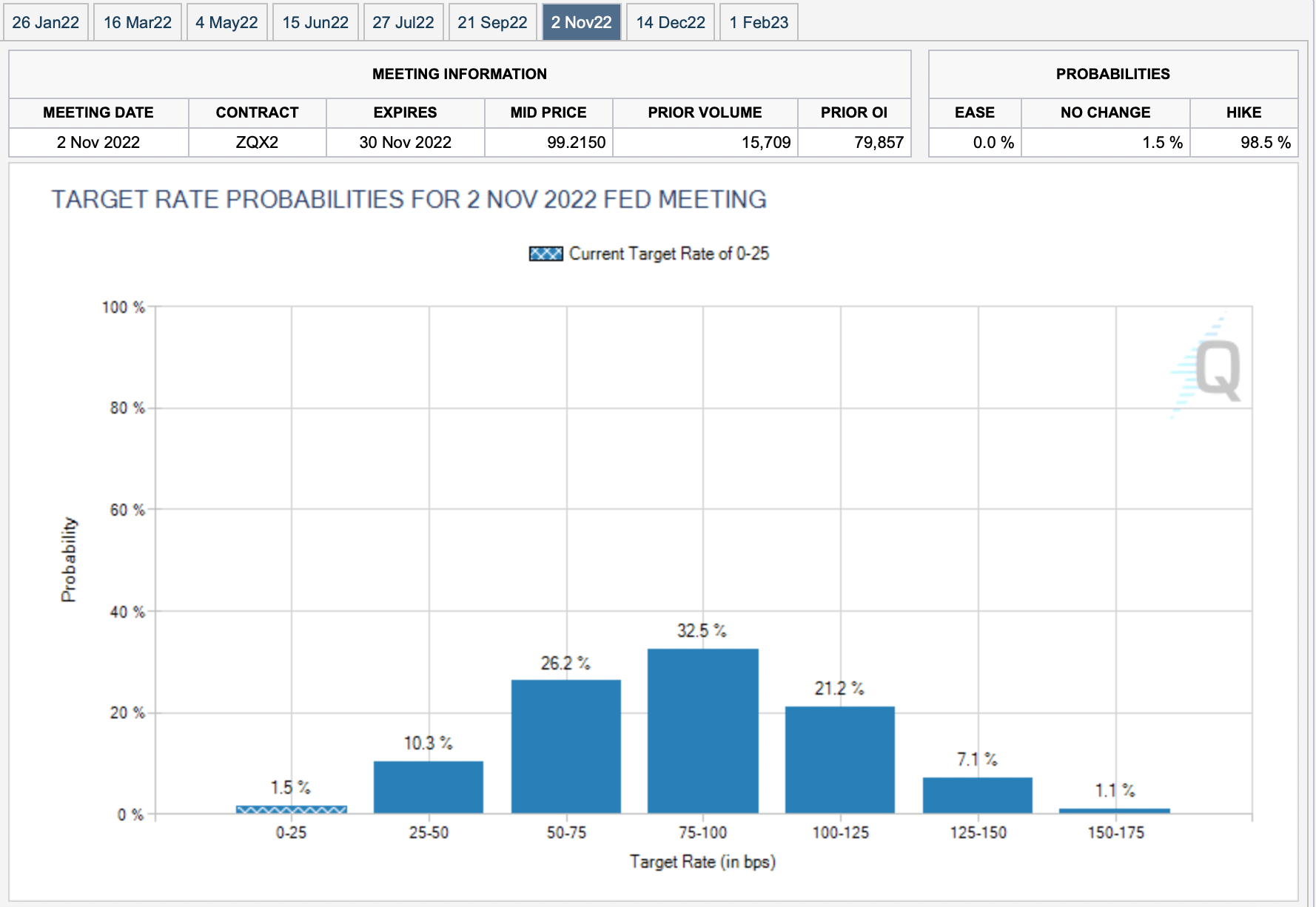 Распределение вероятностей значений ключевой ставки процента в США на 2 ноября 2022 г. Дата обращения: 06.01.2022. Источник: CME FedWatch Tool.