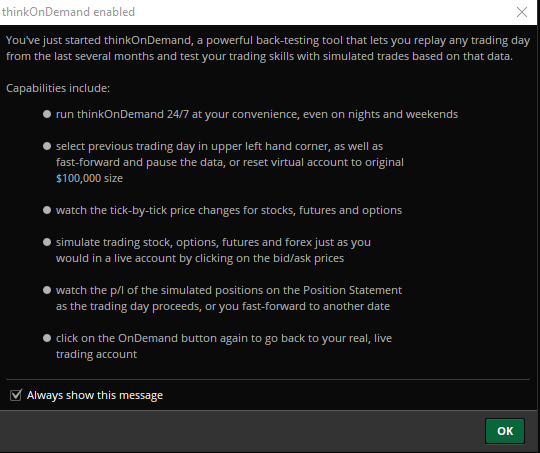 Подобно MetaTrader 4, платформа Thinkorswim также имеет собственный полноценный режим профессионального симулятора торговли!