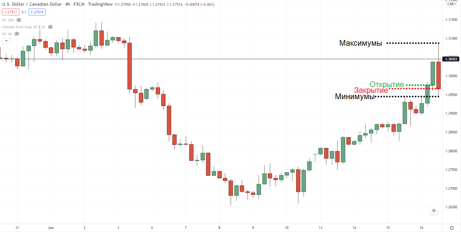 Возьмите цены открытия, закрытия, максимальные и минимальные значения для этой свечи: