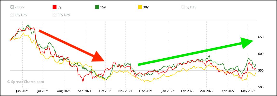 Сезонная динамика котировок кукурузы CORN с июня по май (красная линия – среднее за 5 лет; зеленая – за 15 лет; желтая – за 30 лет). Источник: spreadcharts.com. Дата обращения: 3 ноября 2021 г. Данная информация не является инвестиционным советом.