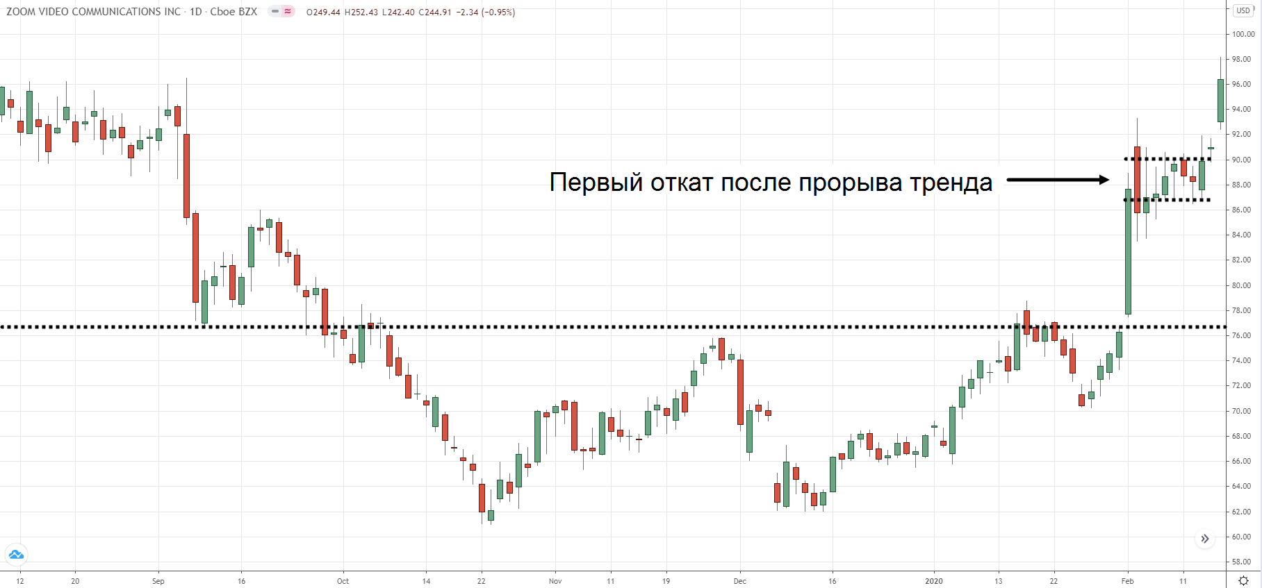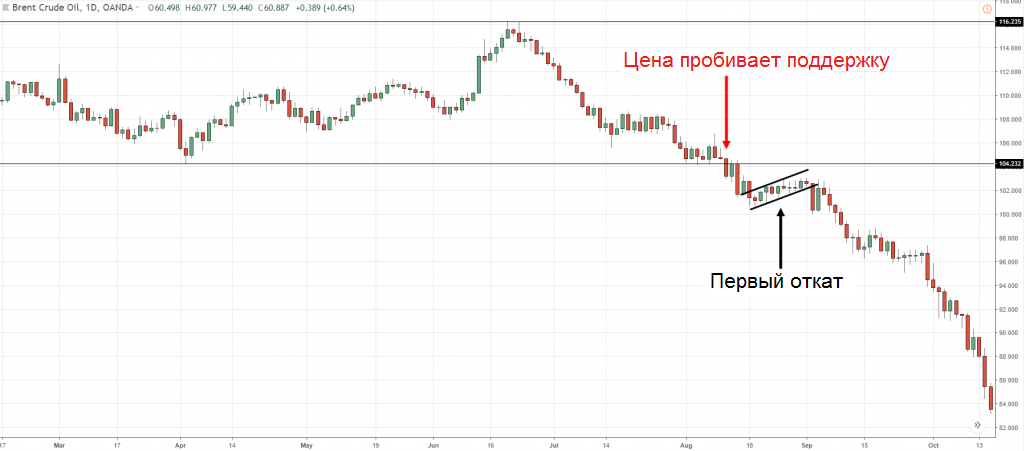 2. Зафиксирован самый первый ценовой откат после того, как «линия поддержки» была пробита.