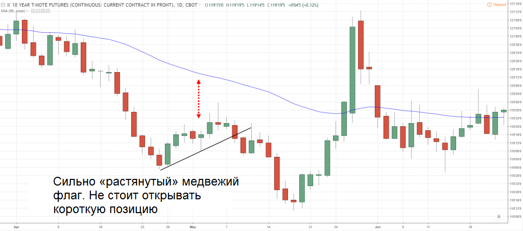 Это похоже на резинку, которая находится в растяжении до тех пор, пока не вернется к средним значениям. Проще говоря, если рынок «перегружен» (или далеко от «скользящей средней»), не надо совершать короткую сделку по «медвежьему флагу», так как цена, очень вероятно, развернется наверх. Ниже — пример, который хорошо иллюстрирует эту идею.