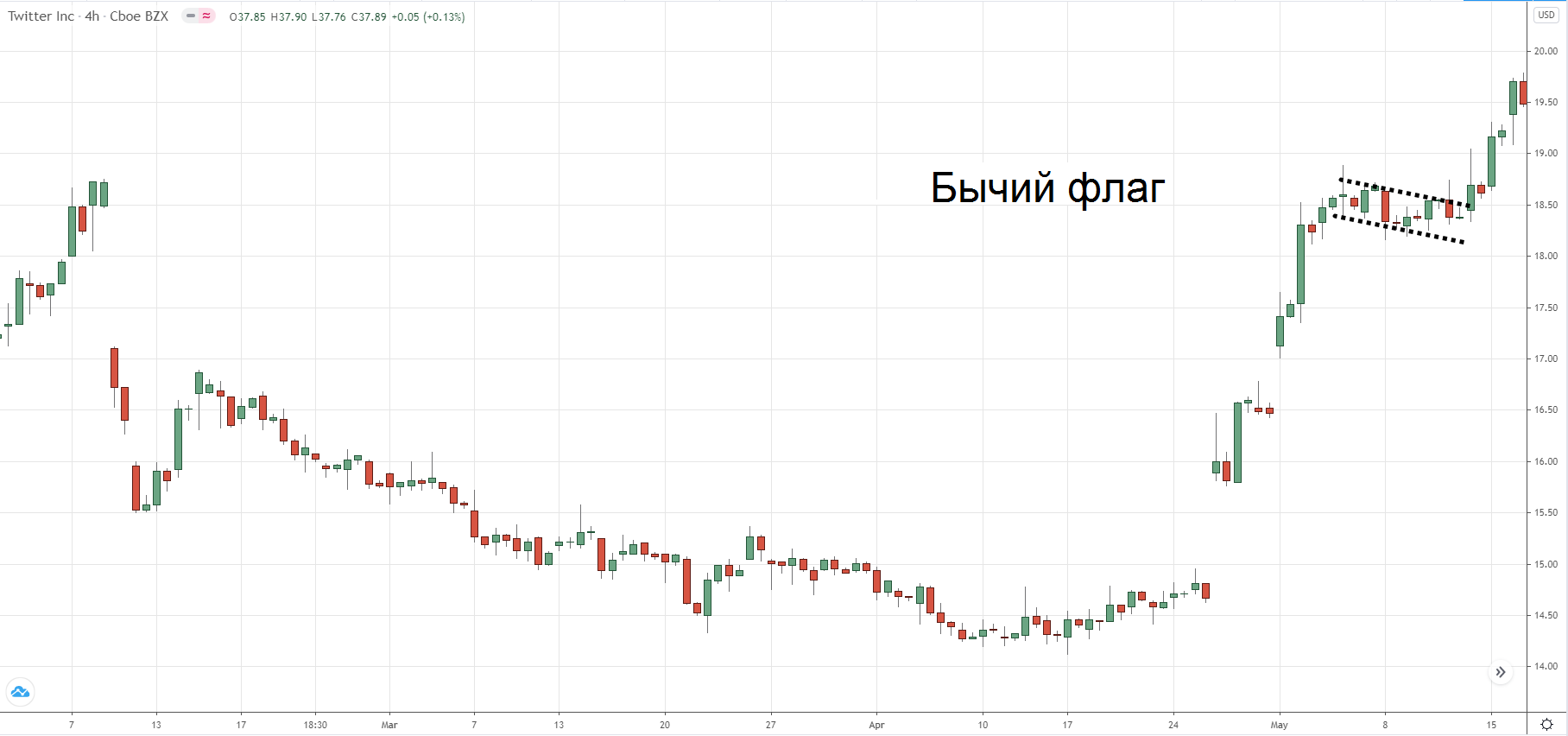 Вот как может выглядеть классический «бычий флаг» на графике.