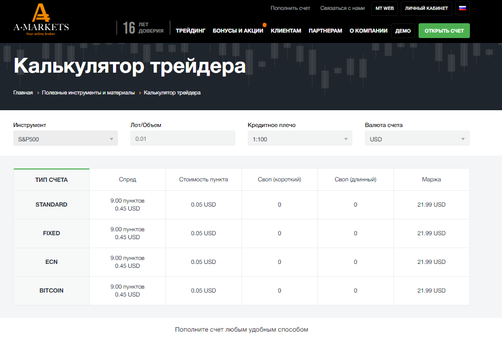 Если вы хотите торговать индексами через брокера AMarkets — воспользуйтесь Калькулятором трейдера для обсчета торговых условий. Это быстро и удобно!