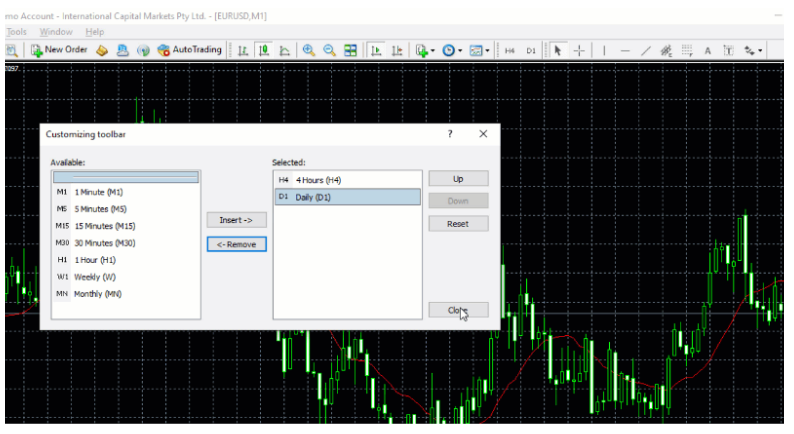 Удалите все кнопки таймфреймов на вашем графике, кроме H4 и D1, а также уберите инструменты на верхней панели рядом с вашими линиями и инструментами Фибоначчи.