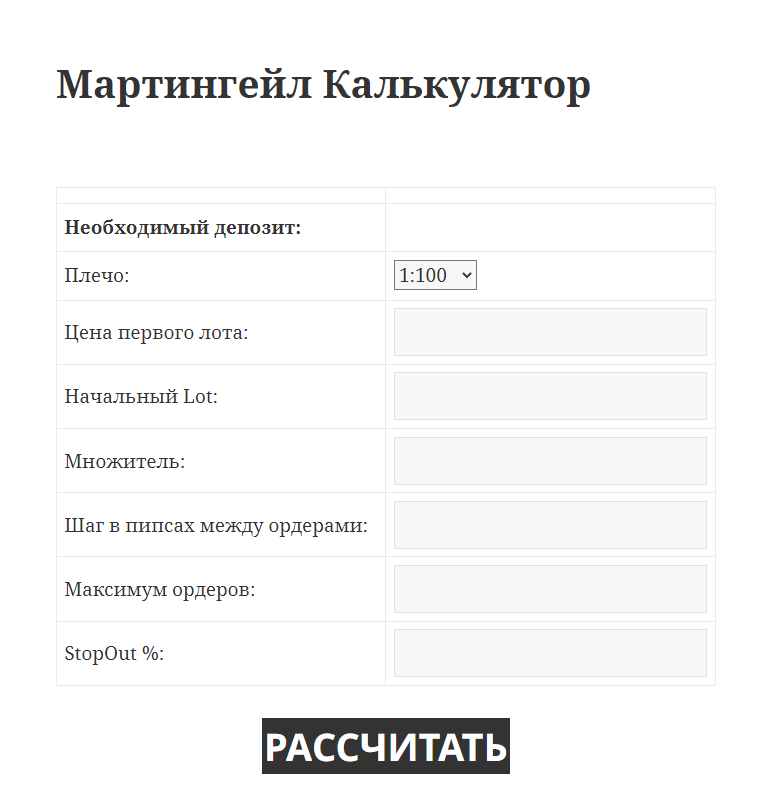 Калькулятор Мартингейла можно использовать для расчета размера депозита и лота для советников Форекс, работающих по принципу Мартингейла. Важно правильно указать уровень Stop Out. На этом уровне сделки будут закрыты принудительно. В основе калькулятора закладывается логика, что последний ордер уже не приносит просадку, а рынок разворачивается так, как нужно.
