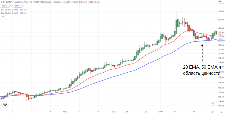 Дожидаемся отката в область рыночной ценности, используя 20ЕМА и 50ЕМА на младшем таймфрейме