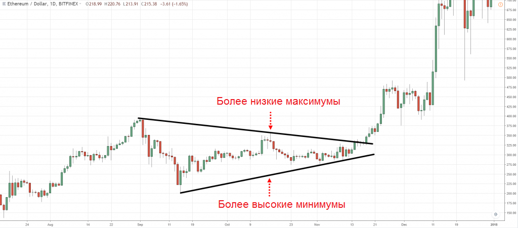 - Треугольник имеет более низкие ценовые максимумы и более высокие минимальные значения.