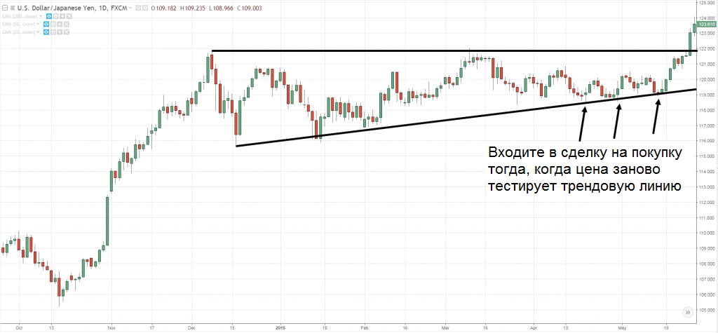 Если вы уверены в своем опыте, можно пробовать метод торговли, ориентированный на точки прорыва. Как это работает? Вы покупаете, когда цена вновь касается линии тренда.