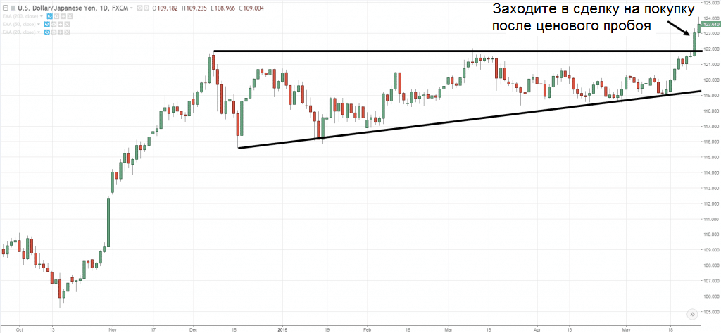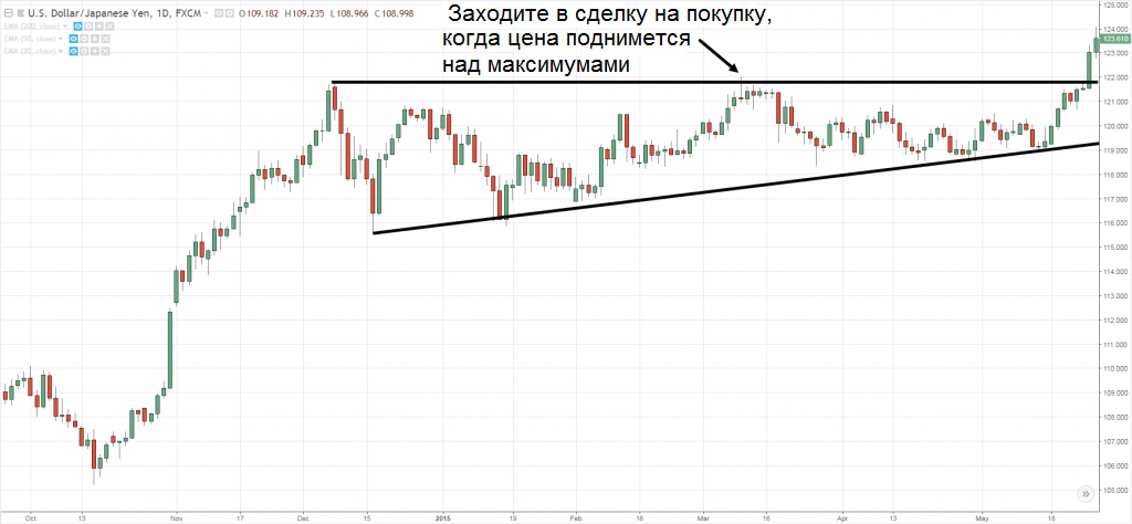 Паттерн предлагает покупать, когда цена попадает в зону над ценовыми максимумами треугольника. В такой ситуации надо просто поставить стоп. Покупать надо сразу после подъема цены выше максимумов.
