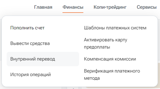 1. В личном кабинете перейдите в раздел «Финансы» – «Внутренний перевод».