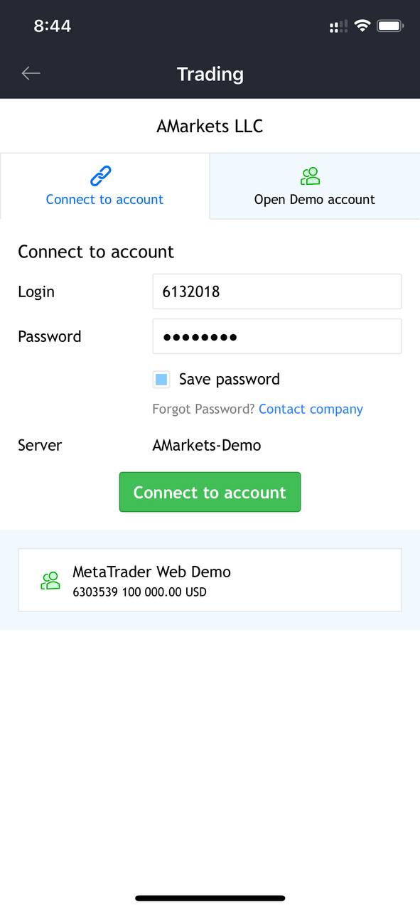 В приложении перейдите в раздел «Демо», далее «Торговля». Введите логин и пароль.